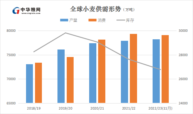 從(cong)全(quan)球小(xiao)麥(mai)(mai)的供需情況來(lai)看(kan),依舊趨(qu)緊(jin)。根(gen)據美國農(nong)業部(bu)11月份發布的報告顯示(shi),全(quan)球小(xiao)麥(mai)(mai)已(yi)連(lian)續(xu)三個年度消費(fei)量高(gao)于產(chan)量,且2022/23年度全(quan)球小(xiao)麥(mai)(mai)期末庫(ku)存連(lian)續(xu)三年下(xia)滑(hua),較上一年度減(jian)少846萬噸(dun),預估為2.678億噸(dun)。