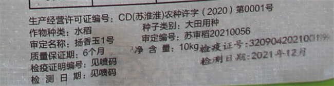 一看作物種類、種子類別、品種名稱、審定編號。如:作物種類:水稻;種子類別:大田用種;品種名稱:楊香玉1號;審定編號:蘇審稻20210056,從審定編號上也能看出是不是新品種。