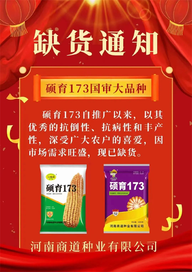 河南商道種業拳頭產品碩育173,大災之年不減產,豐年更高產,盡顯英雄本色。碩育173,自推廣以來,以其綜合性狀優勢,迅速贏得黃淮海地區經銷商和種地大戶高度認可。