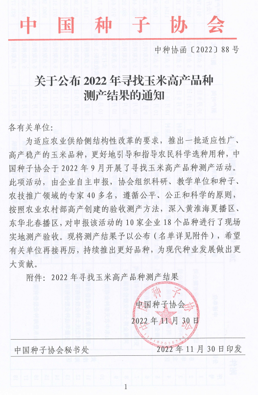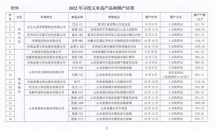 關于公布2022年尋找玉米高產品種測產結果的通知