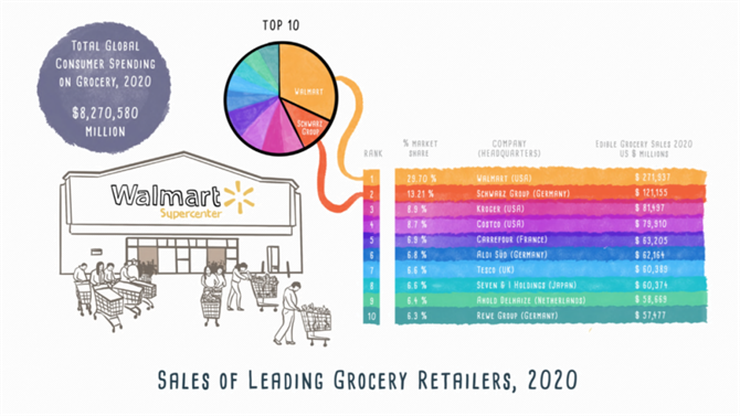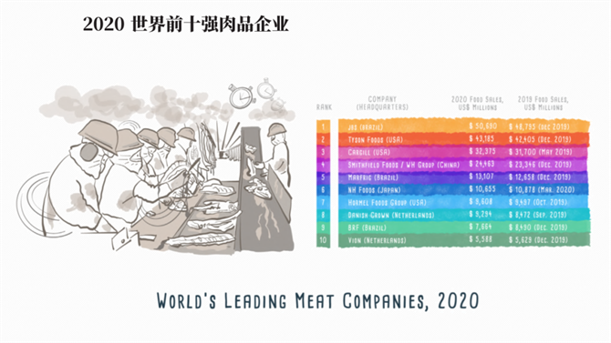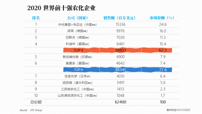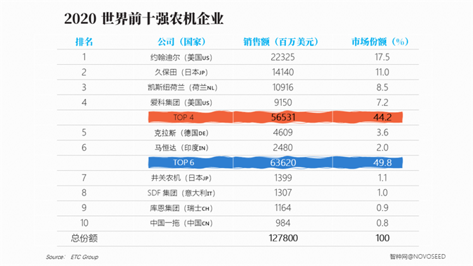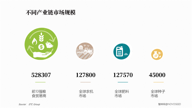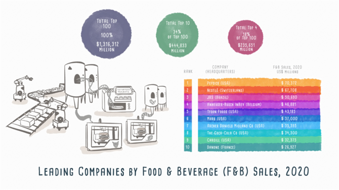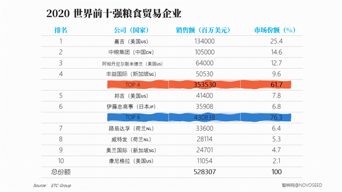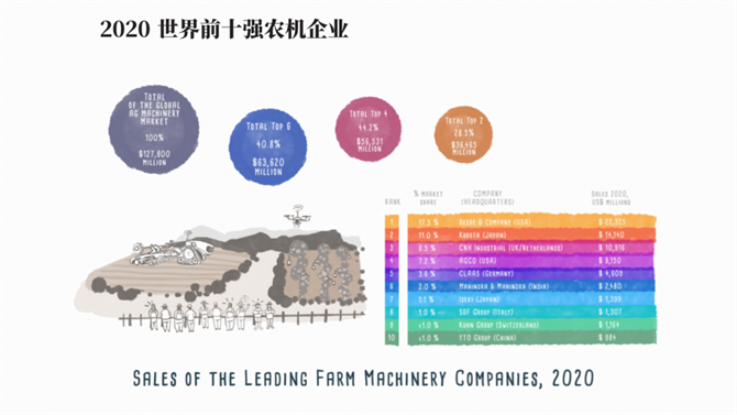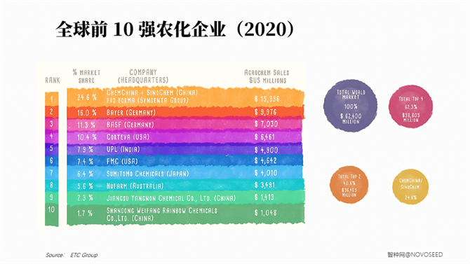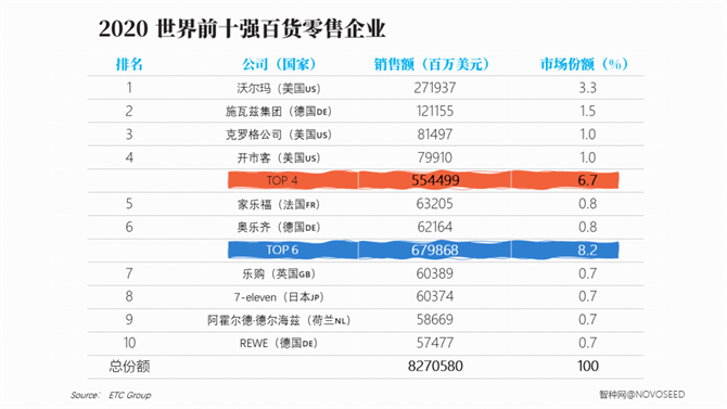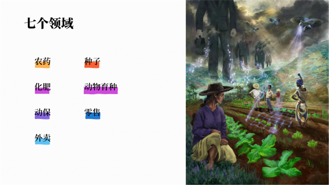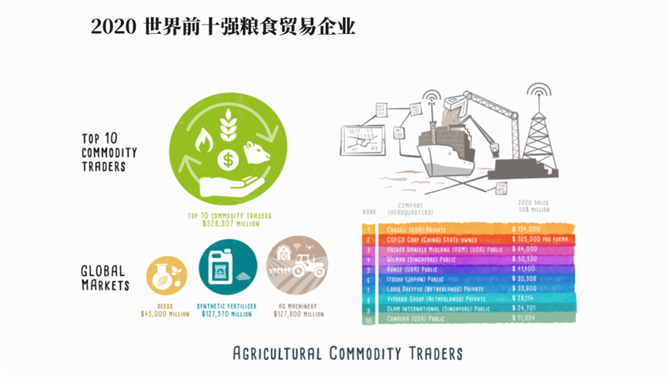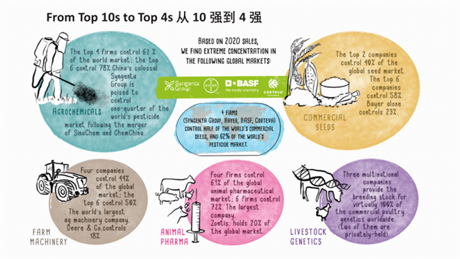 2022 年 ETC 集團對企業集中度的更新提供了世界食品大亨的快照--工業食品和農業鏈上下游的最大參與者。ETC 研究了控制 11 個關鍵工業 "農業食品 "部門的領先企業:種子、農用化學品、牲畜遺傳學、合成肥料、農業機械、動物藥品、商品貿易商、食品加工廠、大肉食、雜貨零售和食品配送。排名是基于2020年的銷售數字。
