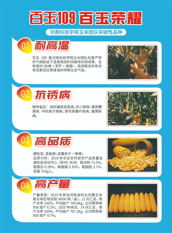 百玉109在河南參加試驗表現突出、數據喜人,已通過河南省審定(豫審玉20220047),黃淮各省已報同步引種。百玉109特征特性:株型半緊湊,平均株高260cm、穗位高100cm; 果穗筒形,平均穗長18.6cm、穗行數16.0行。抗性鑒定:2019、2020年河南農業大學植物保護學院兩年綜合接種鑒定:高抗鐮孢莖腐病,抗小斑病、鐮孢穗腐病,中抗南方銹病,感彎孢霉葉斑病、瘤黑粉病。品質分析:2019年農業農村部農產品質量監督檢驗測試中心(鄭州)檢測:粗淀粉75.5%,粗蛋白9.28%,賴氨酸0.30%,粗脂肪3.7%,容重754g/L。產量表現:2019年參加河南省科企共贏玉米聯合體區域試驗 (4500株/畝),13點匯總,增產點率100%,平均畝產749.6kg,比對照鄭單 958 增產6.2%;2020年續試,14點匯總,增產點率100%, 平均畝產707.3kg,比對照鄭單 958 增產9.7%。