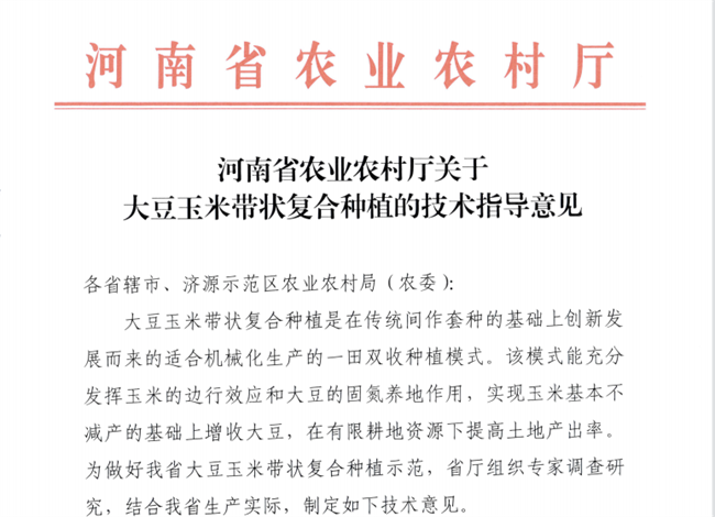 2020 年中央一號文件指出,加大對玉米、大豆間作新農藝推廣的支持力度。農業農村部要求,因地制宜在黃淮海和西南、西北地區示范推廣玉米、大豆帶狀復合種植技術模式,拓展大豆生產空間。2022年,農業農村部在16個省(自治區、直轄市)大力推廣大豆玉米帶狀復合種植技術,擴大大豆種植面積,提高大豆產能。