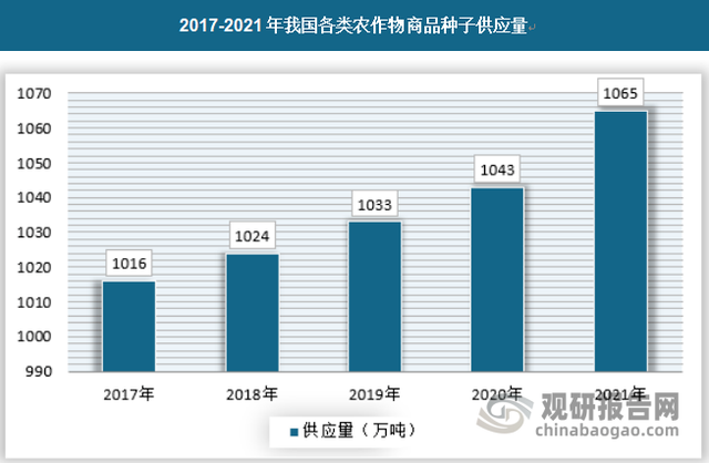 企業實力的增(zeng)強(qiang)大(da)大(da)利于(yu)大(da)規模生產供(gong)應(ying),2021年全國各(ge)類農作物商品種子供(gong)應(ying)量約為1065萬(wan)噸,比上(shang)年度供(gong)應(ying)量增(zeng)加22萬(wan)噸,連續多年保持增(zeng)長。
