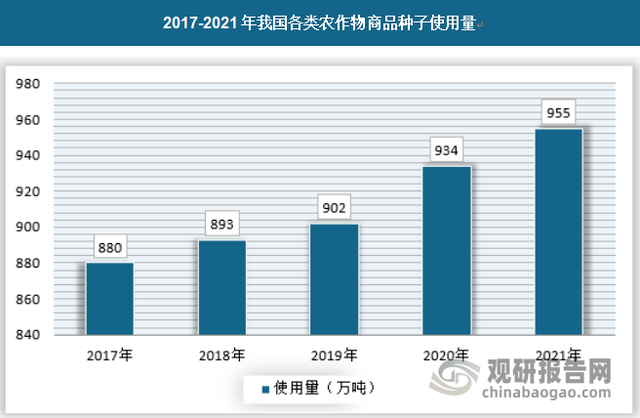 2021年(nian),我國農作物商(shang)品(pin)種(zhong)子(zi)使用(yong)量達到(dao)955萬(wan)噸,保持連(lian)續(xu)增長的(de)(de)態勢,其中小麥、水稻、玉米是最主要的(de)(de)商(shang)品(pin)種(zhong)子(zi)單一需求來源。