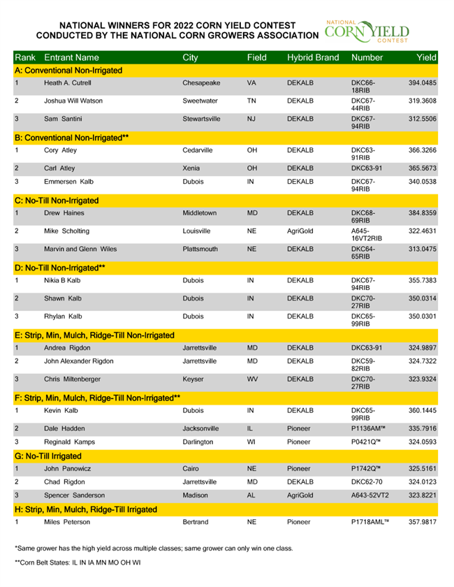 2022 年競賽最高產量 2517.83 公斤/畝,由弗吉尼亞州查爾斯市的玉米種植者大衛·胡拉 (David Hula)在免耕灌溉組田塊創造。品種為先鋒公司 P1222YHR 產量為 602.16 蒲式耳/英畝。他在2019年美國玉米產量競賽創下每英畝616.1953蒲式耳的美國玉米高產紀錄,折合2576.48公斤/畝。
