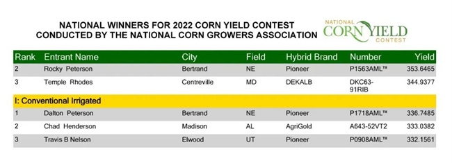 馬里蘭州Middletown的Drew Haines在比賽中獲得了第二高的產量,他的免耕非灌溉田達到了384.8359 bpa。內布拉斯加州Bertrand的Miles Peterson獲得了最高的灌溉產量,他將一塊帶狀耕作的灌溉田推至357.9817 bpa。