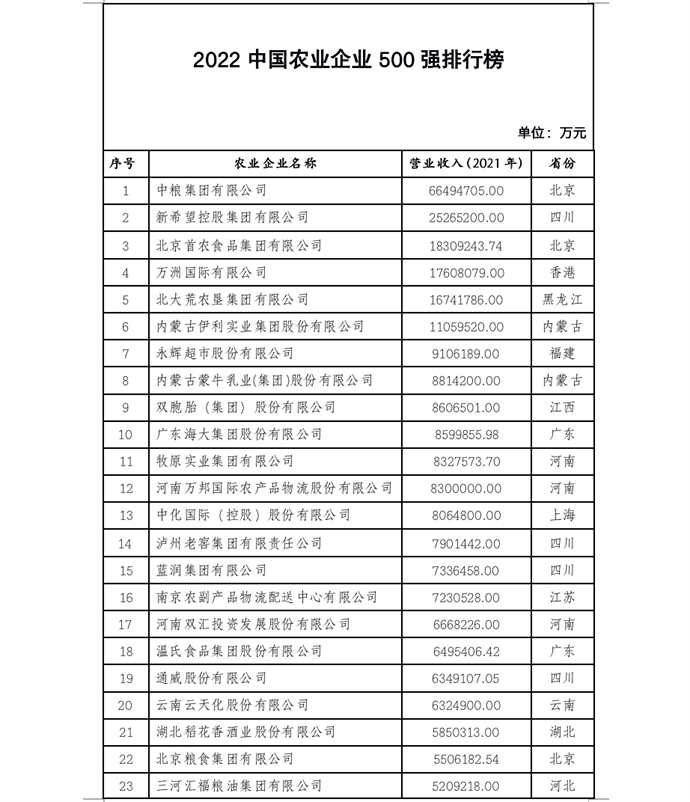 為全面、客觀、系統展現我國農業企業發展情況,營造農業企業參與鄉村振興和建設農業強國的良好社會氛圍,農民日報社發起2022中國農業企業500強評價活動,經信息匯集、嚴格審核、專家評議等程序,形成了《2022中國農業企業500強》(公示版)。