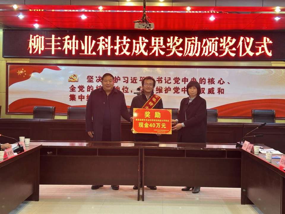 簽約儀式后,在現場嘉賓的見證下,安徽柳豐種業科技有限責任公司對濉溪柳豐農業科學研究所趙太宇團隊給予40萬元獎勵,頒獎現場響起熱烈的掌聲。據悉,柳豐科研所所長趙太宇帶領公司科研團隊發布小麥、玉米和大豆三大農作物育種材料萬余份,通過雜交技術組配、單倍體育種和輪回選擇優選優育,推薦多個柳麥系列小麥新品系、 柳豆系列大豆新品系和柳玉系列玉米新品系進入安徽省品種比較試驗或聯合體區域試驗。自主選育的柳麥618、柳麥716、柳麥2020、柳麥521和柳紫黑麥1號等小麥新品種通過安徽省審定。柳麥1258、柳麥1185和柳麥521、柳麥1257分別進入國家區域試驗和生產試驗;柳麥1259、柳麥1188進入安徽省區域試驗,柳麥528完成省級試驗,正在報審中。公司自主選育的柳玉909正在進行安徽省區域試驗,柳豆108、柳豆119正在進行國家和省級生產試驗。后續選育出的多個小麥、大豆和玉米優勢品系,正在進行多點鑒定、品系比較試驗,有望一批優勢新品系進入國家、省級試驗,形成一系列創新成果和技術標準。