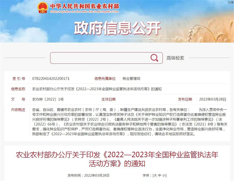 2022年是農業農村部部署開展“全國種業監管執法年”三年行動的第二年。為強化種業知識產權保護,嚴厲打擊假冒偽劣、套牌侵權等種業違法行為,全面凈化種業市場,持續推進種業監管執法年活動,農業農村部開展了2022—2023年全國種業監管執法年活動。