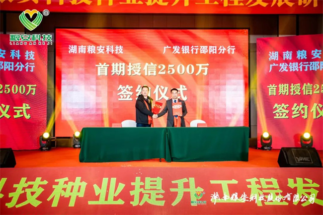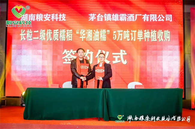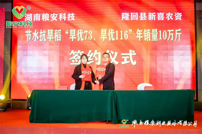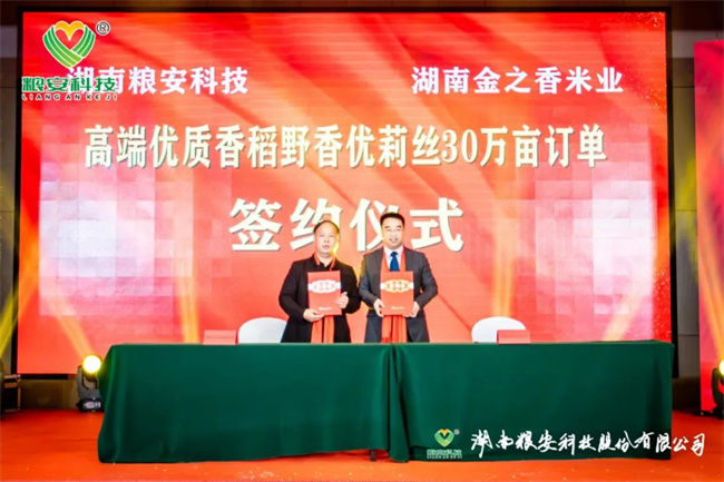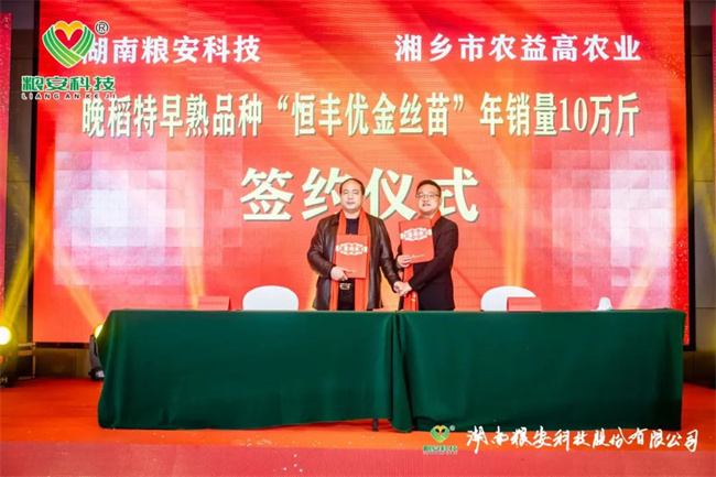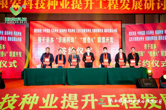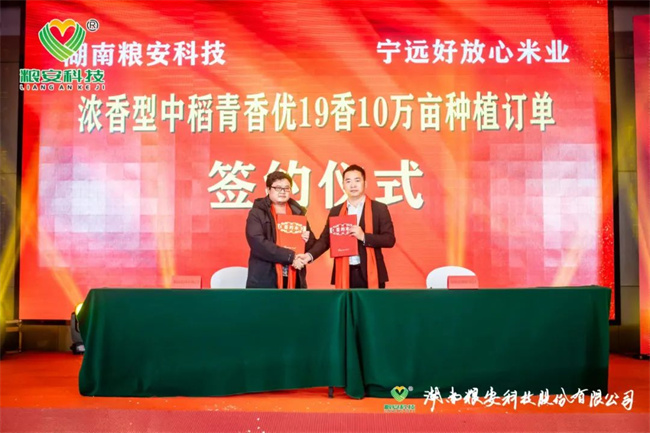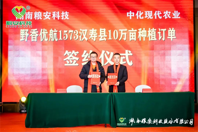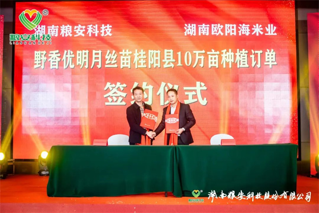 加強合作、實現共贏,是湖南糧安科技股份有限公司永恒不變的追求。本次研討會進行了九輪戰略合作現場簽約儀式,它們分別是:與廣發銀行邵陽市分行首期2500萬授信簽約;與湖南金之香米業有限公司高端優質香稻野香優莉絲南縣30萬畝訂單簽約;與中化現代(湖北)有限公司高端優質香稻野香優航1573漢壽縣10萬畝種植訂單簽約;與湖南歐陽海米業有限公司高端優質香稻野香優明月絲苗桂陽縣10萬畝種植訂單簽約;與湖南好放心米業有限公司濃香型中稻青香優19香寧遠縣10萬畝種植訂單簽約;與湘鄉市農益高農業發展有限公司晚稻特早熟品種恒豐優金絲苗年銷量10萬斤簽約;與隆回縣新喜農資經營有限公司節水抗旱稻旱優73、旱優116年銷量10萬斤簽約;與茅臺鎮雄霸酒廠有限公司長粒優質糯稻華湘油糯5萬噸訂單種植收購;與中種集團、合肥豐樂種業、廣西綠海種業、廣東粵良種業、江西天稻糧安種業、湖南岳麓山水稻等單位簽約公司骨干親本“華湘明珠”和“檀香A”聯合開發框架協議。九輪現場簽約將本次研討會推向一個激動人心的高潮。