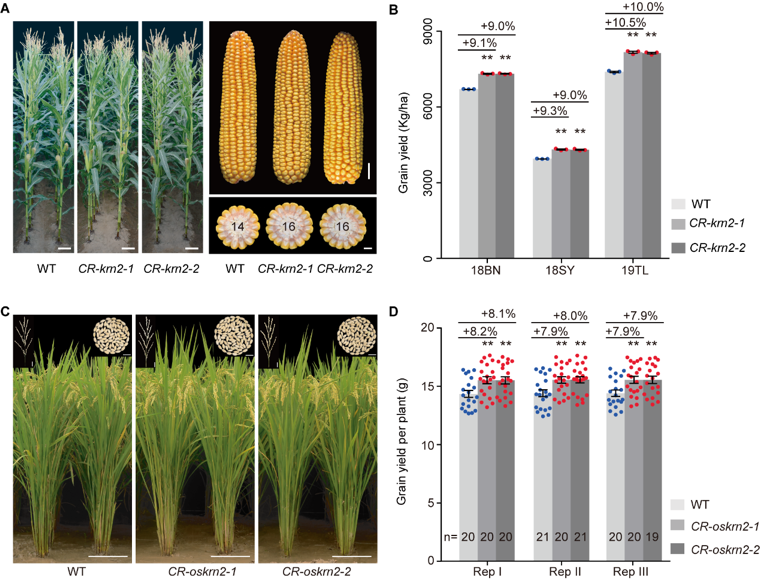 該研究還利用基因編輯技術創制了KRN2和OsKRN2基因功能敲除的新材料。多年多點的田間小區試驗表明,玉米KRN2敲除系和水稻OsKRN2敲除系可分別提高10%的玉米產量和8%的水稻產量,并且對其它農藝性狀沒有明顯的負面影響,展現了巨大的應用潛力。