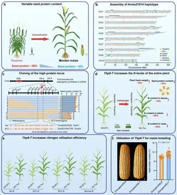 中國科學院分子植物科學卓越創新中心和上海師范大學科研團隊合作,在三亞進行了大規模田間試驗,將野生玉米高蛋白基因Thp9-T雜交導入我國推廣面積最大的玉米生產栽培品種“鄭單958”中,可顯著提高蛋白含量,表明該基因在培育高蛋白玉米中具有重要的應用潛能。同時,在減少氮肥施用條件下可以有效保持玉米的生物量,以及植株和籽粒中氮含量水平,這對于減少化肥使用和保護生態環境具有重要意義。