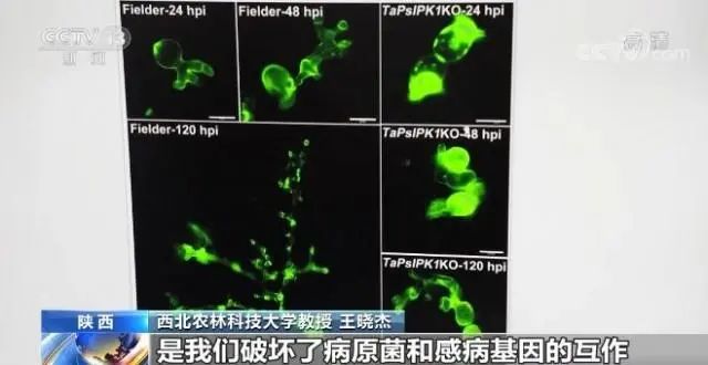 西北農林科技大學教授王曉杰表示,這是我們在熒光顯微鏡下觀察到的病菌的生長發育情況,左邊這一列是在正常情況下,條銹菌侵染小麥后產生的一些侵染結構,而在這一列是我們破壞了病原菌和感病基因的互作,病菌的生長發育受到了嚴重的抑制。“我們通過讓感病基因和病原菌的毒性基因不能碰面,就是讓病菌不能去操縱感病基因,實現了抗病材料的創制。”王曉杰說。