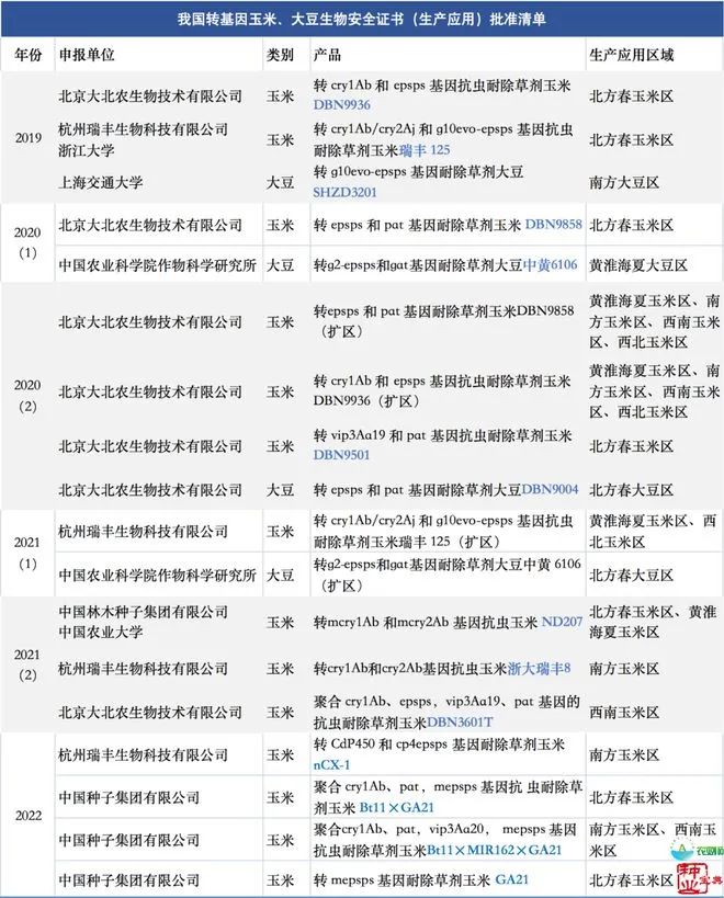 4月29日,農業農村部發布了2022年第一批轉基因生產應用安全證書,其中包括4個轉基因玉米。截至目前,我國已有11個轉基因抗蟲耐除草劑玉米和3 個轉基因耐除草劑大豆獲得生產應用安全證書。
