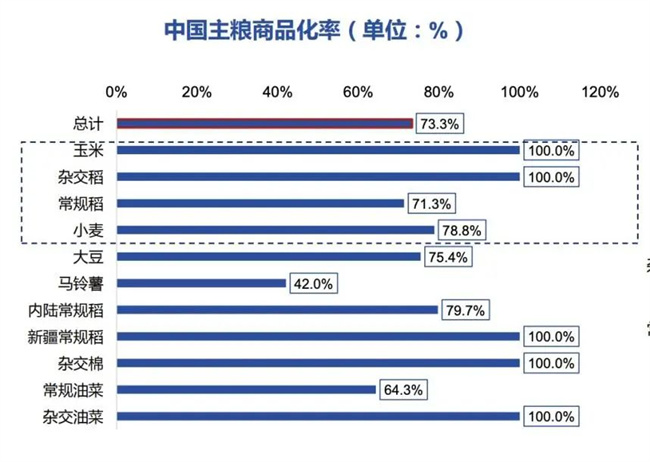 (2)三大主糧商品化率較高,蔬菜品種依賴性高。我國主糧商品化率為73.3%,玉米水稻和小麥三大主糧由于種植面積大,商品化率較高,其中玉米和雜交稻的商品化率達到100%。蔬菜國外品種種植面積占比達到13%(不同的品種比例各不相同),其中,耐儲的番茄、甜椒、洋蔥、胡蘿卜、茄子、馬鈴薯、西藍花等少數專用品種進口比例較大,超50%,少數品種全部依賴進口。