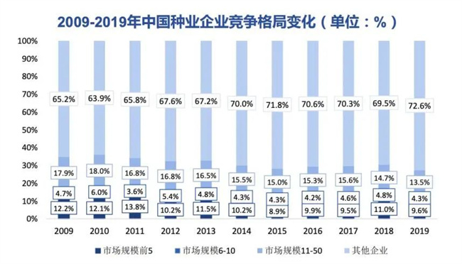 (3)種企數量多,規模小,同質化高。從企業的數量來看,我國種業企業數量較多,2010-2016年,由于系列種業政策出臺,行業門檻提高,企業數量下降至4516家;2016年之后,企業數量呈現上升態勢,2019年種業企業數量達到6393家;從企業規模來看,我國種子企業的整體規模較小,2019年規模3000萬以下的企業占比超65%,一億以上的企業僅占5.35%;從企業競爭格局來看,2019年,中國種業企業CR5市占率僅為9.6%,競爭格局分散,市場競爭激烈;從整體的競爭格局來看,近年來國內企業同質化競爭激烈,行業集中度下降。