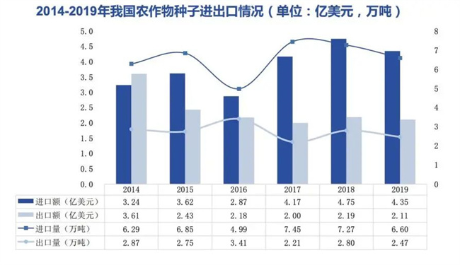 (4)種質資源依賴進口。我國種業大而不強,是種子的凈進口國,2018年貿易逆差達2.24億美元。我國主要的進口種子類別為草種和蔬菜種子,除了玉米種子小比重依賴進口,其余主糧種子基本實現完全自主,自主選育品種面積占比超95%。我國種業派生品種占比較高,而原始創新品種不夠。