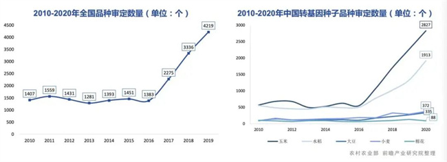 近年來,我國種業自主創新能力限制提升,2017年開始,品種審定數量開始快速激增。2019年全國國審和省審品種審定數量4219個,同比增加26.5%。此外,玉米和水稻轉基因種子的審定數量上升幅度大。截至2020年,玉米的審定數量達到2817個,水稻的審定數量為1913個。