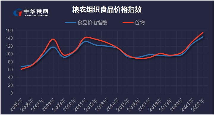 糧農組織谷物價格指數12月平均為147.3點,環比下降1.9%,但同比上漲4.8%。