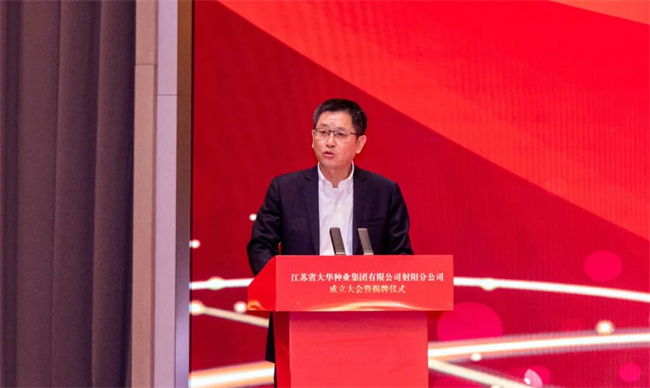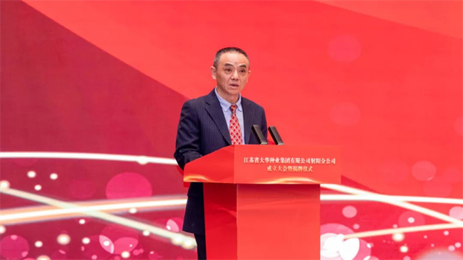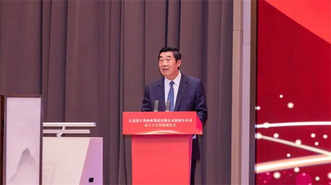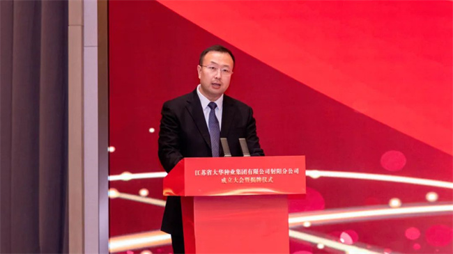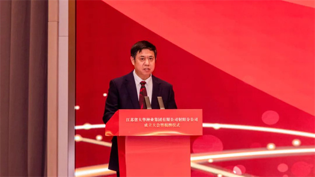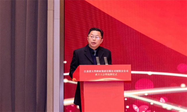 中共射陽縣委書記吳岡玉在致辭指出:堅定不移強優勢,控風險,種業科技自立自強,種源自主可控,真正用種子安全保障農業安全,切實穩住農業高質量發展的基本盤。射陽作為農業大縣,整個糧食播種面積全省第五,產量占全省的1/25,連續12年獲得全國糧食生產安全表彰和激勵。我們堅持農業高質量發展道路,射陽是名副其實的沿海糧倉,也是種子需求大戶。近年來,我們堅持現代農業種業先行理念,進一步推動校院種企密切聯動,聚焦攻關種源核心技術,并建成投用了射陽大米研究院,對“一院兩中心兩基地”來打造射陽大米等一系列農業芯片,北五常南射陽農業名片在持續叫響。奮進新時代,持續推進種業振興,扛起糧食安全責任,打造長三角農業芯片新高地。蘇墾集團是全省農業現代化高標準國有企業,聚焦射陽,為區域農業高質量發展提供有力支撐。相信大華種業射陽分公司的成立,對下一步發展,射陽和大華種業的合作,攜手共進,進一步拓展合作廣度,挖掘合作深度,實現共贏發展,注入更加強勁動能!