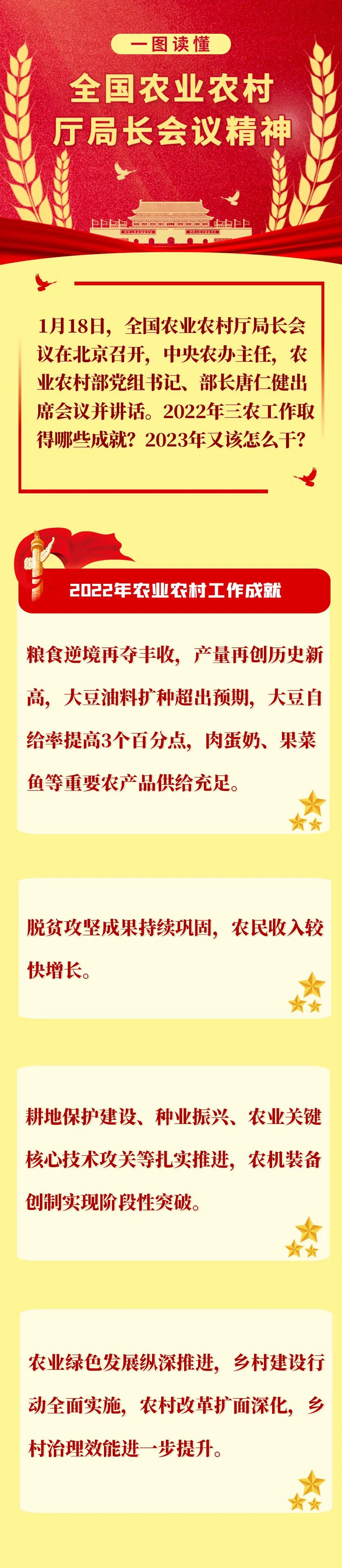 會議強調,今年是全面貫徹黨的二十大精神的開局之年,做好三農工作、支撐保障全局大局的要求更高、任務更重。要協同推進產能提升和結構優化,堅持把保障糧食和重要農產品穩定安全供給作為頭等大事,穩面積、穩產量,擴大豆、擴油料,提單產、提自給率,加快提升糧食綜合生產能力,擴大短缺品種生產,發展現代設施農業,努力完成全年糧食生產目標任務,建立健全多元化食物供給體系。協同推進成果鞏固和農民增收,在強化兜底保障的基礎上,把脫貧群眾放在農民增收大格局中統籌考慮,創新經營增效、就業穩崗、改革活權等機制辦法,努力實現農民增收致富有新渠道、脫貧攻堅成果持續鞏固拓展。協同推進鄉村建設和鄉村治理,穩步推進農村人居環境整治、鄉村基礎設施建設和公共服務提升,建立完善自下而上、農民參與的鄉村建設工作機制,增強鄉村治理效能,加強農村精神文明建設,努力實現宜居宜業和美鄉村建設有新落點、農村生產生活條件加快改善。
