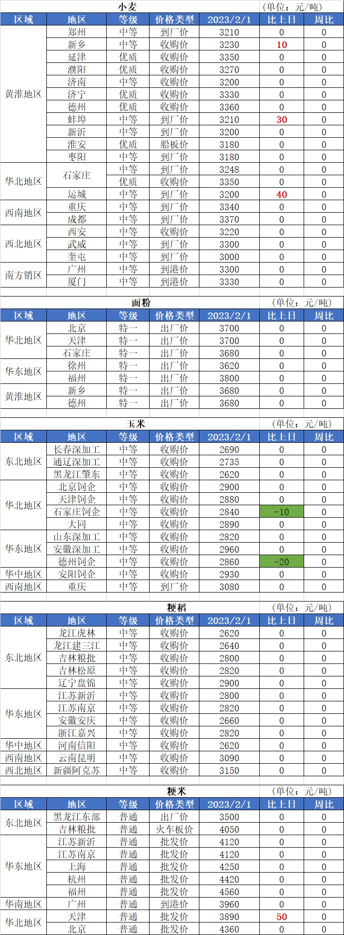 1、2月1日,最低收購價小麥拍賣共投放99703噸,全部成交。其中白小麥13574噸,成交均價2976元/噸;混合麥86129噸,成交均價2944元/噸。