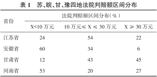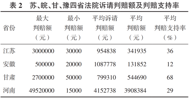 需要說明的是,侵權損害賠償的絕對判賠數額與侵權所造成損失的大小、原告的請求等都有直接關聯。換言之,若損害賠償數額的確定方式不是主要依據法定賠償,則絕對值對比度意義不大;而是要進一步對比法院對原告訴請賠償數額的支持率。在分析樣本中,原告均明確主張了侵權損害賠償的具體數額,但蘇、皖、甘、豫四地法院的支持率同樣存在較大差異(表2)。其中,甘肅法院判賠支持率明顯高于其他三省法院,安徽法院平均判賠支持率最低,江蘇、河南都曾出現高額賠償且判賠支持率為100%的裁判。