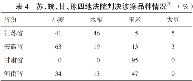 在分析樣本中,涉案品種最多的是小麥、水稻、玉米和大豆4種作物,在分析樣本中所占比重依次為33%、23%、40%、2%。僅從適用法定賠償的裁判來看,侵害玉米品種權平均判賠額最高,其次是水稻、小麥、大豆(表3)。進一步分析可知,在蘇、皖、甘、豫四地法院裁判的案件中,涉及上述品種權侵權案件的分布及占比差異很大。江蘇涉案品種中水稻占比最高、約46%,安徽小麥占比最高、約63%,甘肅玉米占比最高、約95%,河南也是玉米占比最高、約47%(表4)。進一步結合表2蘇、皖、甘、豫四地法院所裁判案件的訴請判賠額可以看出,分析樣本中植物新品種權侵權損害的判賠額與作物品種具有相關性。