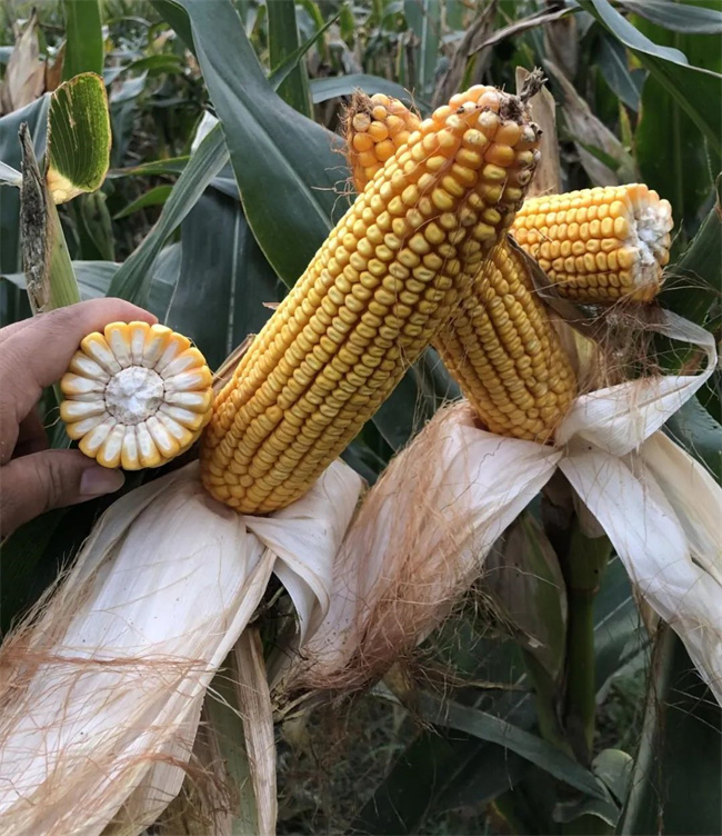 1.花粉量大,花粉活力強,授粉持續時間長,耐高溫,不花粒,沒有畸形穗,苞葉嚴,角質糧,黃金品質,容重778克/升,一粒封頂品質好。