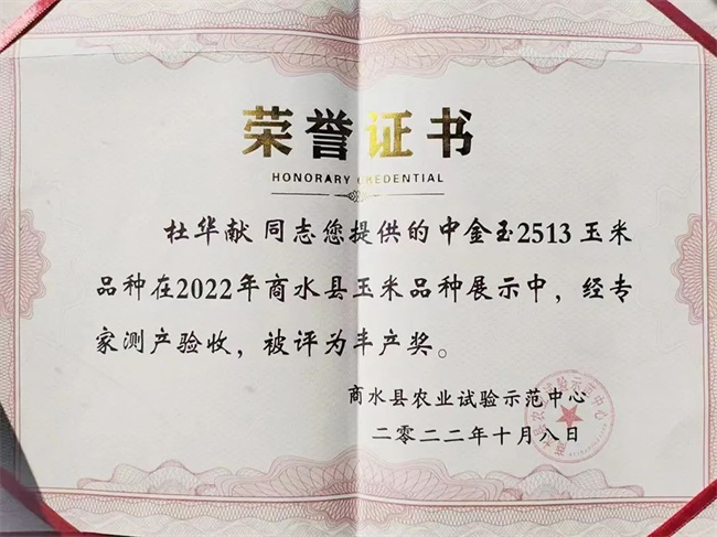 參會客戶高度認可品種表現。沈丘客戶代表王寶軍說道:中金玉2513在2021年、2022年沈丘農技推廣中心每年安排的60多個品種展示中,結實性好,產量高,抗病性好,耐高溫干旱能力強,受到參展單位稱贊;商水縣杜華獻表示,中金玉2513在2022年商水縣農業示范中心產品展示中,因其耐高溫能力強,無花粒,豐產性好,綜合抗性優勢突出,榮獲參展品種“豐產獎”。