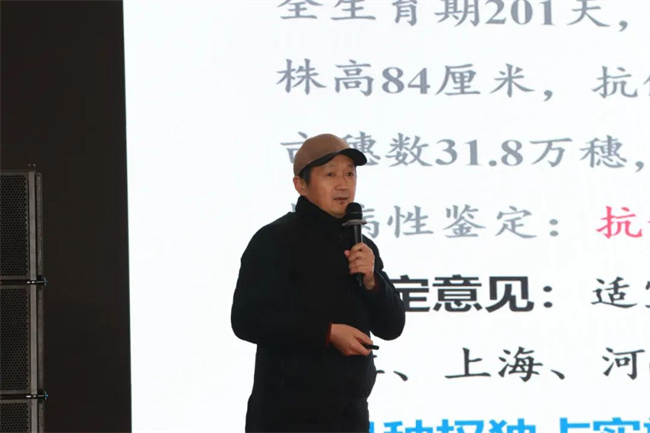 揚州市農科院小麥育種家張伯橋研究員對小麥新品種揚麥33、揚麥34進行精彩分享。揚麥33是2021年國審抗赤霉病、高抗白粉病高產小麥新品種,適應范圍廣,品種權由明天種業獨家運營。2022年,張洪程院士等組成的專家組對揚麥33評價:“赤霉病抗性突出,同時兼抗白粉病等,綜合性狀優良,實現了赤霉病與高產協同遺傳改良的重大突破,對于解決我國小麥嚴重病害問題意義重大。”國家小麥產業技術體系首席肖世和研究員也給揚麥33很高評價,“赤霉病抗性試驗達到抗級水平,屬國內罕見。”揚麥34,高產穩產品種,2021年、2022年連續兩年畝產超600公斤,中抗赤霉病、抗白粉病、抗逆性好,株高76cm左右,莖稈粗壯,基部節間短,抗倒性好。