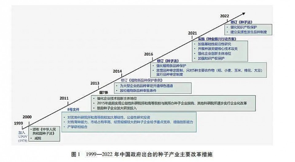 過去20多年,國家出臺一系列促進種業發展的改革措施(圖1)。1997頒布《植物新品種保護條例》,中國政府開始實質性承認育種者權利;1999年中國加入《國際植物新品種保護公約》(UPOV的1978版本),中國種業啟動了現代化進程;2000年頒布的《種子法》,種子產業開啟了向商業化邁進的大門;此后,為了發展現代化種業,政府又出臺了一系列政策與改革措施。