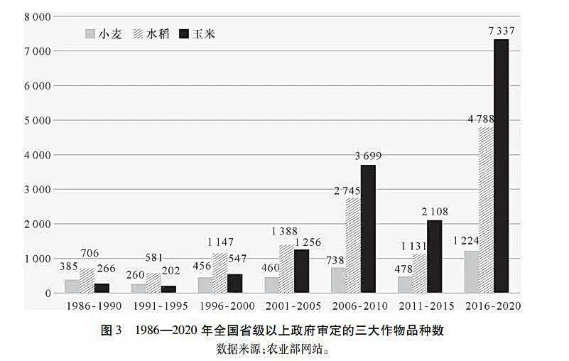 國家每年審定的種子品種數居高不下,表現突出的具有重大創新性的品種極少。過去20年,每年審定的品種數量在波動中快速增長,特別是自2016年以來的增長出現井噴現象。例如,到2019單審定的水稻品種數就高達1329,2020年和2021年又分別增長到1914和2195;2019年審定的玉米品種數更高達2266,2020年和2021年更分別增長到2827和玉米304。眾多的種子意味著缺乏能占領較大市場的有重大創新的種子,同時也意味著存在過多的實質派生品種或品種同質化嚴重的現象。