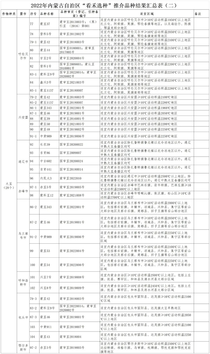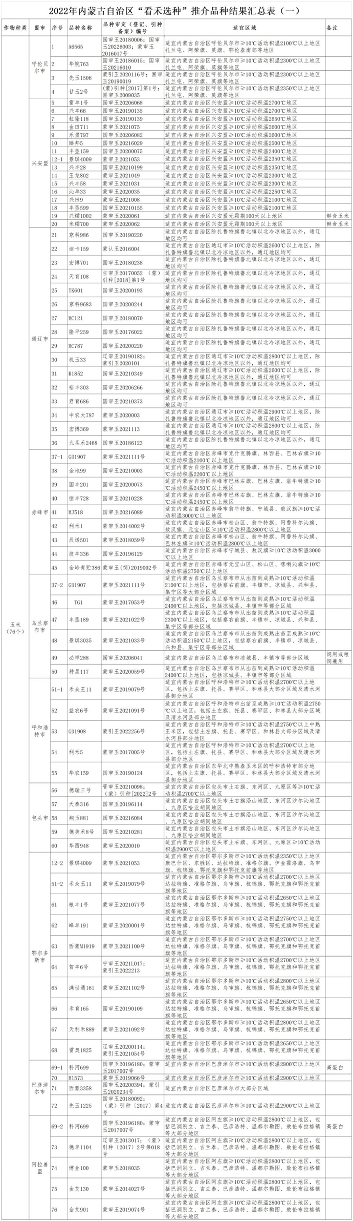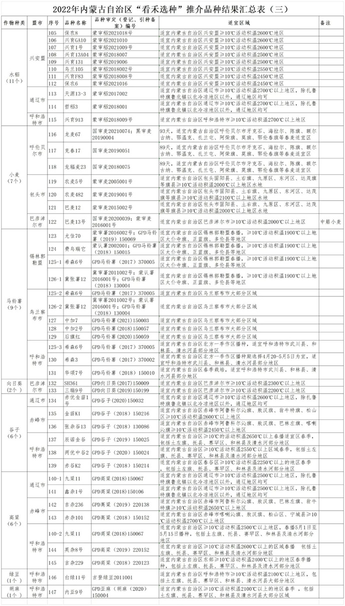 2022年,自治區農牧廳按照“建基地、引品種、促推廣”的工作思路,緊緊圍繞確保糧食安全,聚焦主要糧食作物,在全區建設“看禾選種”平臺60個,涵蓋了玉米、大豆、水稻、小麥、馬鈴薯、向日葵、雜糧雜豆等主要糧食作物和自治區特色優勢作物,集中展示示范農作物品種2190個。通過組織現場觀摩、跟蹤評價、實收測產、專家論證等方式綜合評價,優選出了適合全區不同區域種植的優良農作物品種147個,其中玉米品種76個,大豆品種28個,水稻品種11個,小麥品種7個,馬鈴薯品種9個,向日葵品種2個,雜糧雜豆品種14個,供廣大農民朋友選種參考。