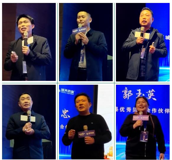 ▲優秀縣級合作伙伴睢縣王德亮(一排左一)、尉氏李新志(一排中)、柘城李海河(一排右一)和太康萬新衛(二排左一),優秀鄉鎮渠道商商丘楊節忠(二排中)、睢縣郭玉英(二排右一)做經驗分享