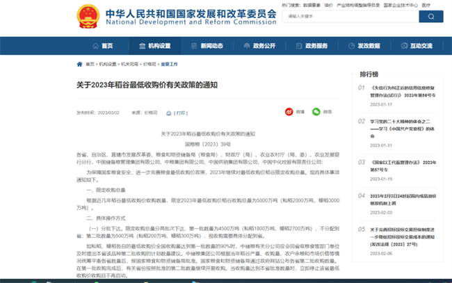根據近幾年稻谷最低收購價收購數量,限定2023年最低收購價稻谷收購總量為5000萬噸(秈稻2000萬噸、粳稻3000萬噸)。