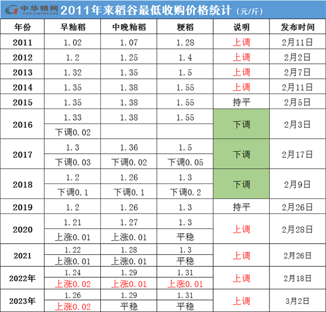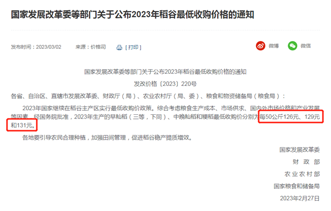 據國家發改委通知,2023年國家繼續在稻谷主產區實行最低收購價政策。綜合考慮糧食生產成本、市場供求、國內外市場價格和產業發展等因素,經國務院批準,2023年生產的早秈稻(三等,下同)、中晚秈稻和粳稻最低收購價分別為每50公斤126元、129元和131元。對比來看,早秈稻比2022年上漲2分,連續4年上調,中晚秈稻和粳稻保持平穩。