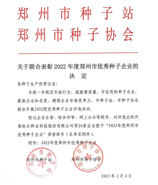 2023年3月4日,鄭州市種子協會“2022年度鄭州種子企業培訓表彰會”在高新區麗致酒店隆重召開。