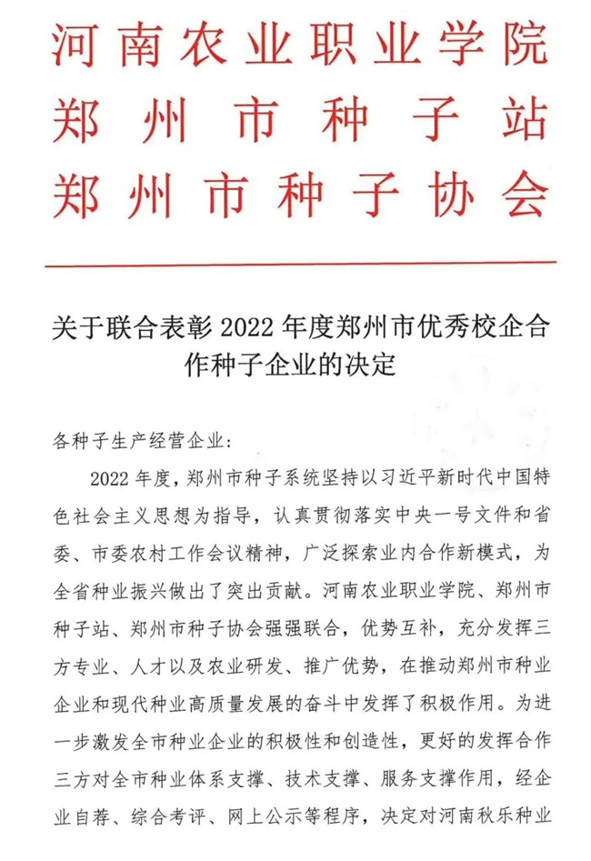 協會副會長、河南農業職業學院農業工程學院院長王立河教授宣讀“2022年度優秀校企合作種子企業表彰名單”(名單附后)