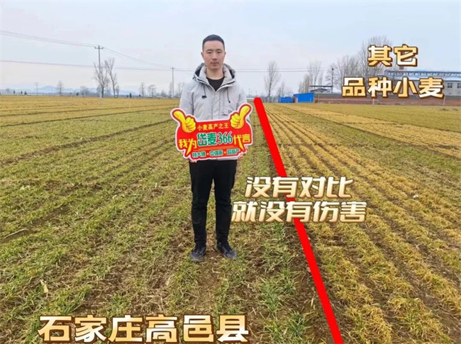 各位參會伙伴來到岱麥366苗期觀摩田,一眼望去,岱麥366與左右相鄰兩地塊的麥苗形成鮮明對比。岱麥366葉片濃綠,苗齊苗壯,根系發達,無任何凍害現象發生,而相鄰兩塊麥田均出現不同程度的干尖黃葉,任何小麥品種,只有保證苗期植株健壯,無凍害病害的發生,豐收才有保障。