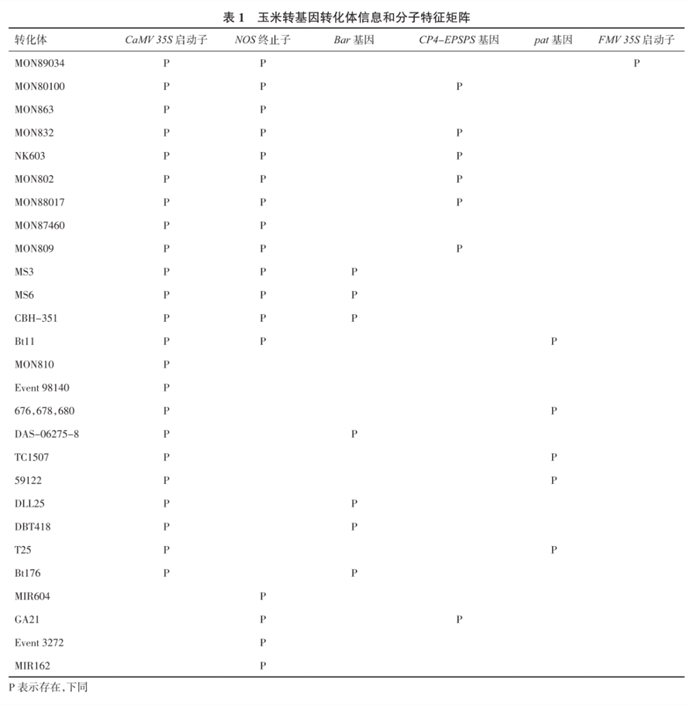 玉米有27個轉基因轉化體,多樣的轉基因轉化體增加了對玉米中轉基因成分篩查的難度。根據轉基因檢測數據庫(GMDD,http://gmdd.shgmo.org/,下同)、歐洲轉基因生物指南(http://www.gmo-compass.org/eng/gmo/db,下同)和美國環境風險評估中心轉基因作物數據庫(CERA,http://www.cera-gmc.org/,下同),以轉基因玉米商業化的轉化體作為行,以基因元件作為列,構建玉米轉基因轉化體信息和分子特征矩陣(表1)。在表1中的27個玉米轉化體中,出現頻次最高的元件是CaMV 35S啟動子,出現23次;其次是NOS終止子,17次;之后是Bar基因和CP4-EPSPS基因,各7次;pat基因出現5次;FMV 35S啟動子1次。