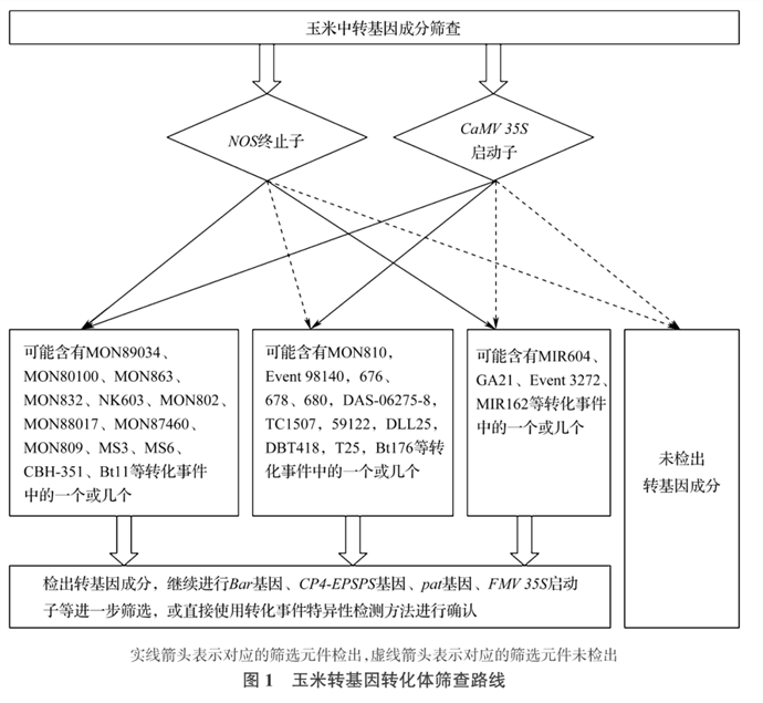 在對大量玉米樣品進行轉基因檢測時,首先聯合使用CaMV 35S啟動子和NOS終止子進行篩查,然后根據篩查結果,按照圖1進行轉化體的進一步分析和確定。圖1中鏤空箭頭表示篩選的路線,實線箭頭表示對應的篩選元件檢出,虛線箭頭表示對應的篩選元件未檢出。如果CaMV 35S啟動子和NOS終止子的檢測結果都為陰性,則認為樣品中未檢出轉基因成分。如果CaMV 35S啟動子和NOS終止子的檢測結果任何一個為陽性,則認為樣品中檢出轉基因成分。對于篩查出陽性的樣品,需要繼續進行其他元件的篩查,如Bar基因、CP4-EPSPS基因、pat基因、FMV 35S啟動子,或者直接使用轉化體特異性檢測方法進行確認。