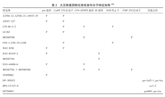 大豆商業化轉化體中,pat基因、花椰菜花葉病毒的CaMV 35S啟動子、CP4-EPSPS基因、Bt抗蟲基因4個靶標元件組合使用,可以實現對表2中的已知12個大豆轉化體的轉基因篩查檢測。其他3個轉化體DP-305423、DP356043和BPS-CV127-9,可使用專門的轉化體特異性檢測方法進行單獨檢測。