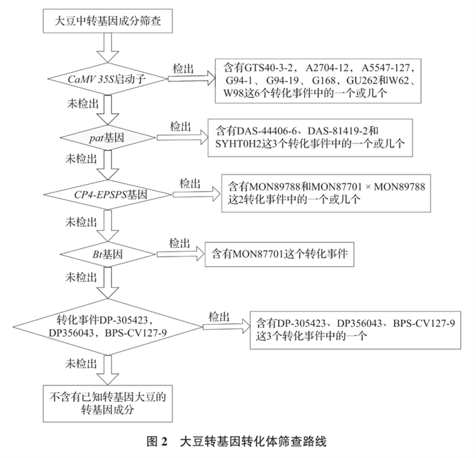 在對大量大豆樣品進行轉基因檢測時,按照CaMV 35S啟動子、pat基因、CP4-EPSPS基因、Bt基因和轉化體特異性檢測的順序進行篩查,如圖2所示。如果CaMV 35S啟動子、pat基因、CP4-EPSPS基因、Bt基因和轉化體特異性檢測結果都為陰性,則認為樣品中未檢出轉基因成分。如果CaMV 35S啟動子、pat基因、CP4-EPSPS基因、Bt基因和轉化體特異性檢測結果任何一個為陽性,則認為樣品中檢出轉基因成分。