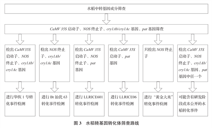 在對大量水稻樣品進行轉基因檢測時,按照CaMV 35S啟動子、NOS終止子、cry1Ab/cry1Ac基因、pat基因進行篩查,然后根據篩查結果,按照圖3進行轉化體的進一步分析和確定。如果CaMV 35S啟動子、NOS終止子、cry1Ab/cry1Ac基因和pat基因等元件的檢測結果都為陰性,則表明樣品中未檢出已知的轉基因轉化體。如果CaMV 35S啟動子、cry1Ab/cry1Ac基因、NOS終止子和pat基因等元件的檢測結果任何一個為陽性,則認為樣品中檢出轉基因成分。