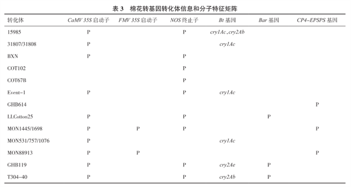 在表3的13個棉花轉化體中,有10個轉化體含有CaMV 35S啟動子。不含有CaMV 35S啟動子的3個轉化體中有2個含有NOS終止子(COT102和COT67B),1個含有CP4-EPSPS基因(GHB614)。這說明,同時進行CaMV 35S啟動子、NOS終止子和CP4-EPSPS基因檢測,可以覆蓋所有的13個棉花轉化體。