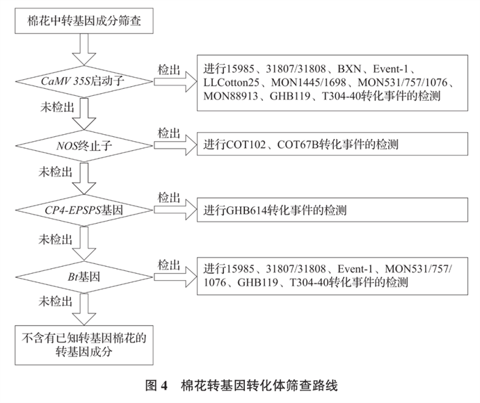 在對大量棉花樣品進行轉基因檢測時,按照CaMV 35S啟動子、NOS終止子、CP4-EPSPS基因和Bt基因的順序進行篩查,如圖4所示。如果CaMV 35S啟動子、NOS終止子、CP4-EPSPS基因和Bt基因檢測結果都為陰性,則認為樣品中未檢出轉基因成分。如果CaMV 35S啟動子、NOS終止子、CP4-EPSPS基因和Bt基因檢測結果任何一個為陽性,則認為樣品中檢出轉基因成分。