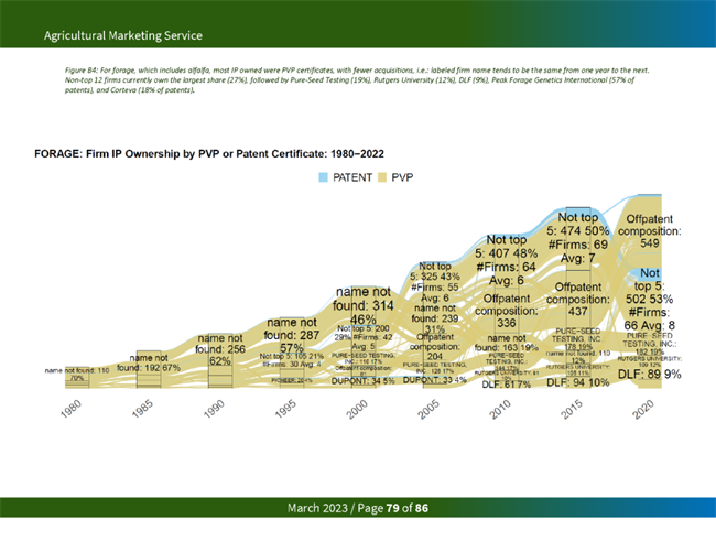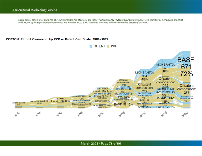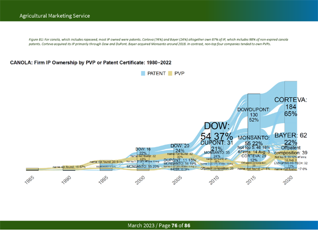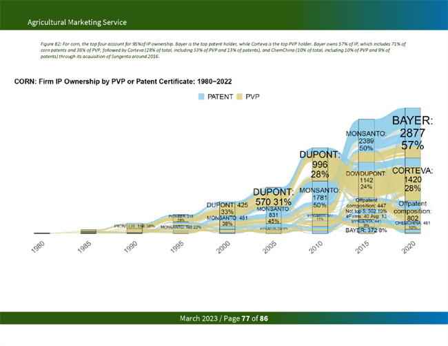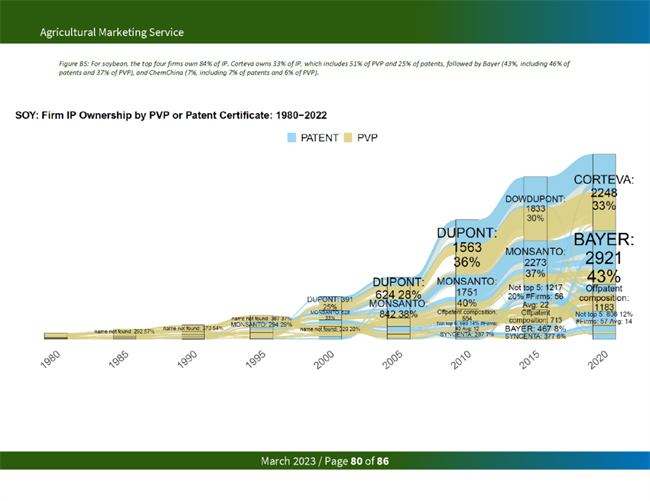 占主導地位的種子公司從知識產權限制中獲益匪淺。一項研究發現,2015年,杜邦和孟山都公司擁有玉米和大豆品種所有專利和 PVP 權利的 80% 左右。在今天的美國主要商品中,美國農業部發現,前四大種子公司擁有 97%的油菜籽、95%的玉米、84%的大豆、51%的小麥和74%的棉花的知識產權。