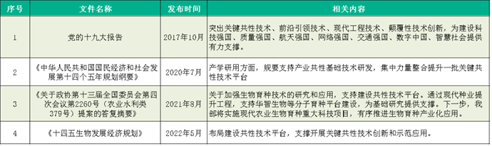 我國陸續出臺的政策也是支持種業關鍵技術和平臺建設的堅實基礎。“十四五”規劃中明確提出:產學研用方面,要支持產業共性基礎技術研發,集中力量整合提升一批關鍵共性技術平臺;黨的十九大報告提出,“突出關鍵共性技術、前沿引領技術、現代工程技術、顛覆性技術創新”;發改委印發的《“十四五”生物經濟發展規劃》更是指出:布局建設共性技術平臺,支撐開展關鍵共性技術創新和示范應用;黨的二十大提出,深入實施種業振興行動,強化農業科技和裝備支撐,健全種糧農民收益保障機制和主產區利益補償機制;2023年,中央一號文件指出,深入實施種業振興行動。構建開放協作、共享應用的種質資源精準鑒定評價機制。全面實施生物育種重大項目,扎實推進國家育種聯合攻關和畜禽遺傳改良計劃……